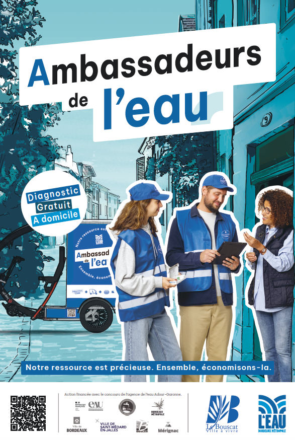 Prochainement, les ambassadeurs de l’eau de la Régie de L’Eau Bordeaux Métropole seront présents dans notre commune pour effectuer des visites en porte-à-porte et vous proposer gratuitement un diagnostic de vos points d’eau (robinets, chasses d’eau, douches). En fonction des besoins spécifiques à votre logement, ils pourront installer des équipements hydro-économes (mousseurs, réducteurs de débit, etc.) et/ou vous conseiller quelques gestes simples pour économiser l’eau et réduire votre facture. Un moment privilégié pour poser toutes vos questions sur l’eau du robinet.