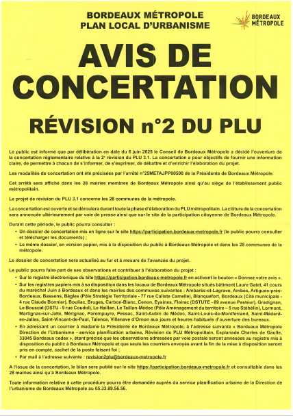 Le Conseil de Bordeaux Métropole a décidé, par délibération du 6 juin 2025, d’ouvrir la concertation publique relative à la 2ᵉ révision du Plan Local d’Urbanisme métropolitain (PLU 3.1). Le projet de révision du PLU 3.1 concerne les 28 communes de la métropole.