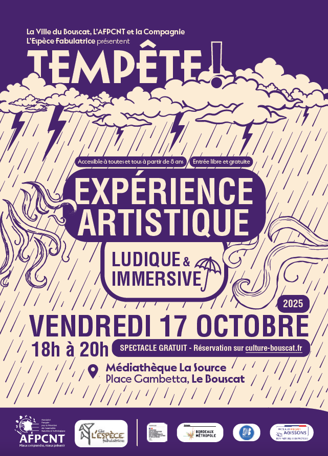 Pendant deux heures, vivez une expérience artistique inédite : que se passe-t-il quand le vent se met à souffler et que la météo se déchaîne ? Sur quelles ressources intimes et collectives pouvez-vous compter pour traverser une tempête ? Dans une ambiance ludique, entre spectacle immersif et atelier artistique, vous êtes invités à vivre et ressentir les éléments, pour apprivoiser vos émotions et apprendre les bons comportements. L’objectif : traverser, dans un cadre ludique et sécurisant, le processus d’une tempête !